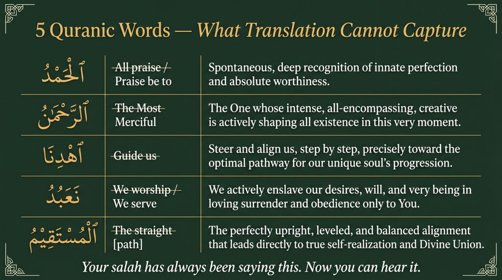 Here are five words that lose the most in translation. Specifically, five words you recite in every salah — whose root meanings, once understood, change how you experience your prayer permanently.